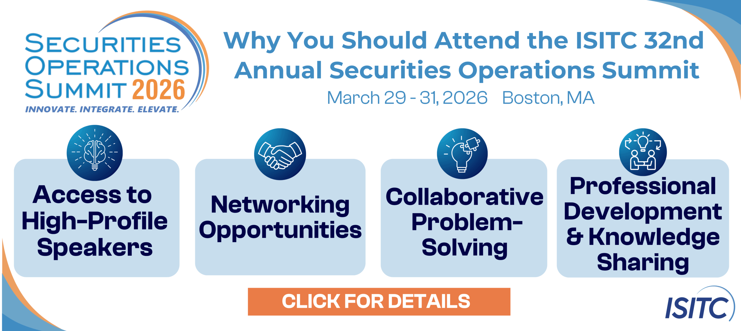 ISITC’s 32nd Annual Securities Operations Summit is themed Advancing Today, Transforming Tomorrow: Driving the Next Era of Financial Services. ISITC has been at the forefront creating the path forward in financial services and the Summit is a must-attend event for professionals in the financial services industry, offering a unique opportunity to engage with thought leaders and innovators shaping the future of the sector. This Summit will explore critical topics such as Cybersecurity, AI, Digital Assets, T+1 in EU/UK, Regulatory, and more.